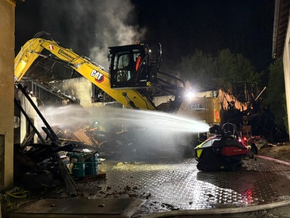 Der Hollfelder Löschroboter wurde umgehend in den Gefahrenbereich geschickt, um die mit Löscharbeiten beschäftigten Atemschutztrupps soweit wie möglich zu entlasten. Die Löscharbeiten wurden anschließend in Zusammenarbeit mit der Drehleiter aus Pegnitz fortgesetzt. Nachdem das Gebäude mit einem Bagger eingerissen wurde, erfolgten noch Nachlöscharbeiten. Die letzten Einsatzkräfte aus Hollfeld konnten die Einsatzstelle gegen 1:30 Uhr verlassen.