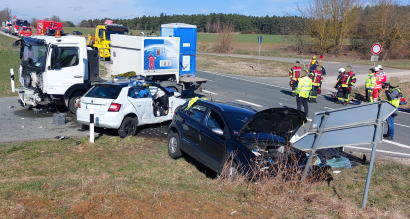 An der Abzweigung nach Stechendorf waren ein LKW und ein PKW zusammengestoßen, ein weiterer PKW wurde in das Unfallgeschehen verwickelt. Beim Eintreffen der ersten Einsatzkräfte stellte sich leider heraus, dass eine PKW-Fahrerin, die allein in ihrem Fahrzeug unterwegs war, ihren schweren Verletzungen bereits erlegen war. Die weiteren Unfallbeteiligten waren leicht verletzt und hatten ihre Fahrzeuge bereits verlassen.