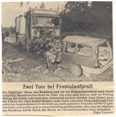 | Samstag | 21.11.1992 | 2:30 | Verkehrsunfall zwischen Hollfeld und Königsfeld |