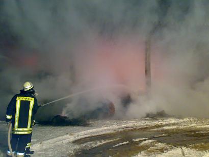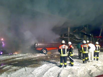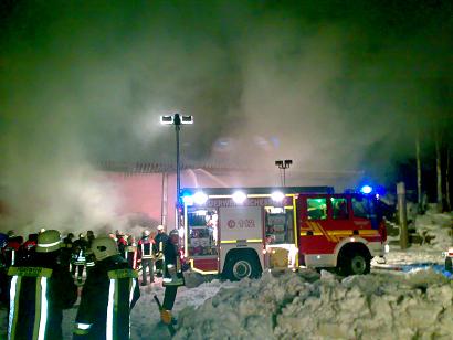 Gegen 18.25 Uhr wurde die Feuerwehr Hollfeld zum Brand einer landwirtschaftlichen Lagerhalle zwischen Treunitz und Königsfeld gerufen. Auf der Anfahrt wurde bekannt, dass die ca. 20 x 10 Meter große Halle bis ans Dach mit Strohballen gefüllt und vor Ort kein Wasser verfügbar war. Erschwerend kam hinzu, dass die Halle nur über einen Forstweg erreicht werden konnte. Dieser Weg musste erst mit einem Radlader von den Schneemassen befreit werden, ehe Fahrzeuge direkt ans Brandobjekt fahren konnten. Das HLF 20/16 der FF Scheßlitz wurde schließlich direkt an der brennenden Scheune stationiert, das HLF der FF Königsfeld an der Kreuzung zur Ortsverbindungsstraße. Mit dem Hollfelder HLF 20/16 und dem LF 16/12 wurde aus Königsfeld Wasser an die Einsatzstelle transportiert und das Fahrzeug der FF Königsfeld gespeist.