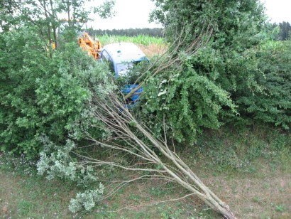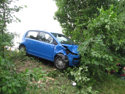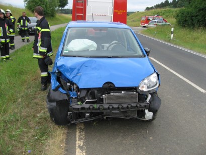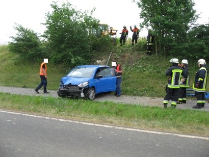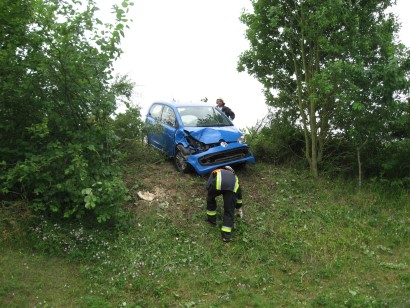 Am Dienstag, 12.07.2016, wurde die Feuerwehr Hollfeld um 7.25 Uhr zu einem Verkehrsunfall auf die Staatsstraße zwischen Hollfeld und Sachsendorf alarmiert. Eine PKW-Fahrerin kam von der Straße ab und landete in einer kleinen Baumgruppe. Das Fahrzeug war von der Straße aus kaum sichtbar, weshalb Rettungsdienst und Feuerwehr zuerst an der Einsatzstelle vorbeifuhren. Die verletzte Fahrerin meldete sich nun ein weiteres Mal über Notruf und sagte, dass die Einsatzfahrzeuge schon vorbeigefahren sind, woraufhin die Feuerwehr kurz vor Sachsendorf wendete. Zwischenzeitlich bemerkte auch ein Jogger den Unfallwagen. Er brachte die Fahrerin zurück auf den Radweg, der an der Straße entlang führt und machte auch ein weiteres Fahrzeug der Feuerwehr Hollfeld auf die Unfallstelle aufmerksam.