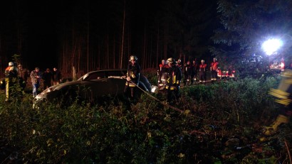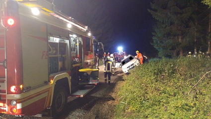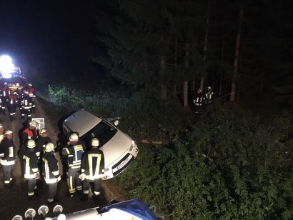 Am Dienstag, 31.10.2017, wurde die Feuerwehr Hollfeld um 17.57 Uhr zu einem verunfallten PKW im Wald zwischen Drosendorf und Wiesentfels alarmiert. Ein Jäger kam, vermutlich wegen eines Schwächeanfalls, mit seinem Geländewagen vom Waldweg ab und fuhr eine kleine Böschung hinauf. Aufgrund der Schräglage des Fahrzeugs drohte dieses umzukippen. Beide Insassen konnten den PKW auch nicht verlassen. Nachdem sich sämtliche Feuerwehrkräfte und der Rettungsdienst am Feuerwehrhaus in Freienfels gesammelt hatten, ging es im Konvoi mit ortskundigen Lotsen an Board in das unwegsame Waldgelände. Vor Ort wurde der PKW mittels Greifzug gesichert.