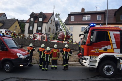 Am Mittwoch, 24.07.2024, wurde die Feuerwehr Hollfeld um 18.58 Uhr zu einem Wohnhausbrand in der Bahnhofstraße in Hollfeld alarmiert. Beim Eintreffen an der Einsatzstelle schlugen bereits Flammen aus dem Dachstuhl und es kam zu einer starken Rauchentwicklung. Personen befanden sich zum Glück nicht mehr im Gebäude. Insgesamt drei Atemschutztrupps kamen beim Innenangriff zum Einsatz, während der Löschangriff von außen über ein C-Rohr und die Drehleiter aus Waischenfeld durchgeführt wurde. Das Feuer konnte dank des schnellen Eingreifens innerhalb kurzer Zeit gelöscht werden. Nachdem die Überprüfung mittels Wärmebildkamera und Drohne ergab, dass keine weiteren Glutnester mehr vorhanden sind, konnte nach 30 Minuten "Feuer aus" gemeldet werden.