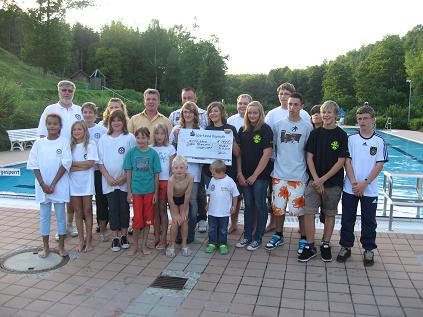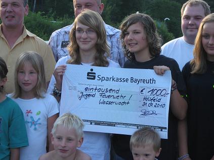 Im Rahmen einer kleinen Feierstunde im Schwimmbad in Hollfeld übergaben die Vorsitzenden der Wasserwacht und der Feuerwehr Hollfeld den Erlös des gemeinsam durchgeführten Public Viewings während der Fussball-WM 2010 an ihre Jugendabteilungen. Insgesamt betrug der Erlös 1000€ weshalb die Jugendfeuerwehr Hollfeld und der Wasserwacht-Jugend je 500€ erhalten. Ein großes Dankeschön an dieser Stelle im Namen der Jugendlichen an alle Aktiven der Feuerwehr und der Wasserwacht, die zum Erfolg der Veranstaltungen während der WM beigetragen haben.