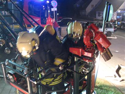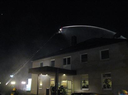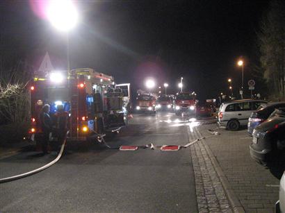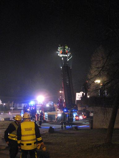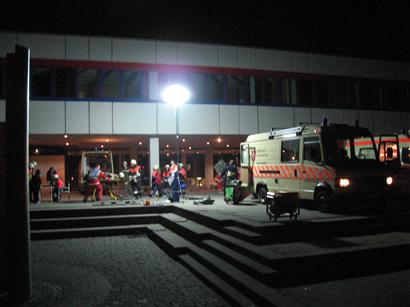 Parallel zur Personenrettung wurde von mehreren Seiten her eine Wasserversorgung errichtet und ein Löschangriff von Außen gestartet. Weiter wurde die Drehleiter der Feuerwehr Scheßlitz in Stellung gebracht, um das Feuer von oben zu bekämpfen. Die Verletzten Personen wurden vor der Stadthalle vom Rettungsdienst erstversorgt und dann zur Behandlung und Betreuung zur Verletztensammelstelle unter dem Vordach der Gesamtschule gebracht. Hier hatten die SEG's aus Mistelgau und Waischenfeld ein Lazarett errichtet. Insgesamt waren 18 Personen zu behandeln. Zeitgleich zur Brandbekämpfung und Personenrettung wurde bekannt, dass zwei unter Schock stehende Personen vermisst werden und Richtung Zeltplatz/Kainachtal davongelaufen sind. Umgehend wurden drei Löschgruppen sowie die Drehleiter zur Suche abkommandiert. Von der Drehleiter aus wurde mittels Wärmebildkamera nach den Vermissten gesucht, welche schließlich auch gefunden wurden.