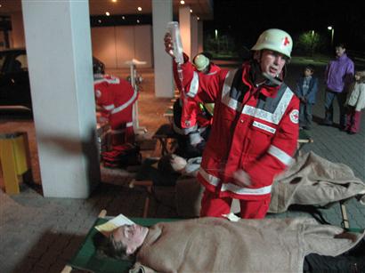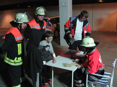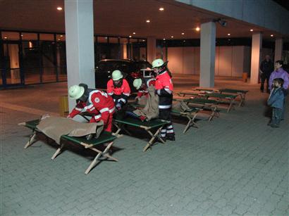 Am Freitag, 16.03.2012, wurde die Feuerwehr Hollfeld um 18.51 Uhr im Rahmen einer Einsatzübung zur Stadthalle in Hollfeld alarmiert. Es wurde angenommen, dass ein Brand im Saal ausgebrochen ist und sich noch zahlreiche Personen im Gebäude befinden. Da es sich um eine Versammlungsstätte handelt wurden, zahlreiche Feuerwehren aus der Umgebung, sowie ein Großaufgebot des Rettungsdienstes angefordert. Primäres Ziel für die eintreffenden Feuerwehren war, die verletzten Personen aus dem Gebäude zu retten. Unter Atemschutz drangen 16 Trupps in die abgedunkelte und vernebelte Halle ein, welche noch von den Faschingsbällen her voll mit Stühlen und Tischen stand. Für die Atemschutzträger war es besonders schwierig, diesen großen Raum systematisch abzusuchen und alle Verletzten zu finden.